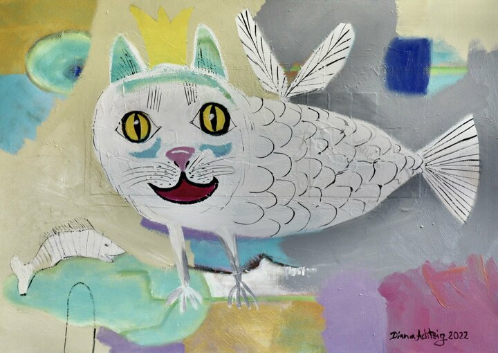 „Katzen Königin – Weißer Katzenfisch mit Flügeln“ (2022, 50 x 70 x 2 cm): Ein mythisches Leitmotiv in einer faszinierenden Tierhybridwelt, das durch harmonische Farbgestaltung und präzise Komposition räumlich und emotional lebendig wirkt.