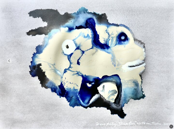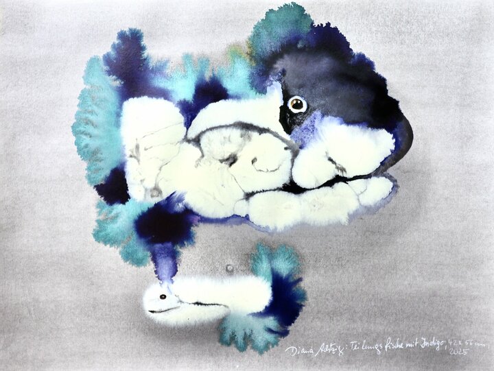Ein zentraler Bestandteil der Ausstellung „Mystische Fische – Eleganz & Tiefsee-Ästhetik in Farbe“ sind die Tuschearbeiten auf Papier, die Diana Achtzig seit 1990 kontinuierlich geschaffen hat. Diese Arbeiten bilden eine eigenständige, intime Ebene der Ausstellung, die es dem Publikum erlaubt, die Entstehung ihrer Bildideen nachzuvollziehen. Die Fischwesen, die auf den Papierformaten erscheinen, sind nicht bloße Abbildungen der Realität, sondern imaginäre Konstruktionen, in denen biologische Logik und surreale Freiheit miteinander verschmelzen.