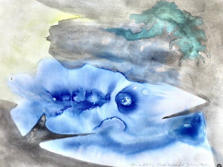 Diana Achtzig (Neue Leipziger Schule): Blauer Tiefseefisch, Tusche auf Papier, Papierarbeit, 50 x 65 cm, 2025 Leipzig. Tusche Malerei Zeichnungen Originale Kunst kaufen!