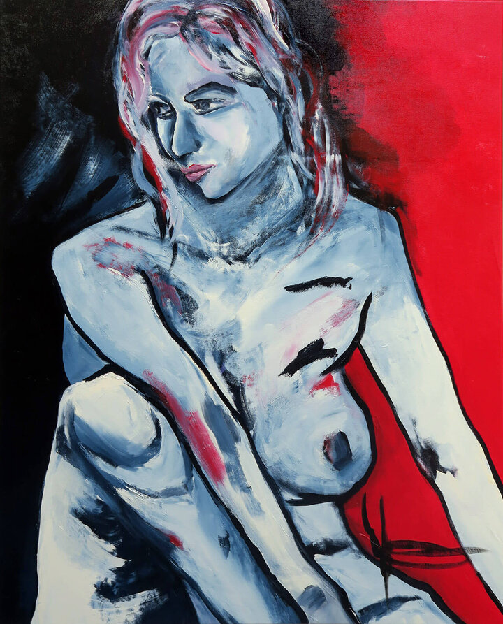 EVA KAISER - weiblicher Akt - 100 x 80 - Acryl auf Leinwand. Zeitgenössisches Gemälde von Eva Kaiser, Mischtechnik mit dynamischen Formen, sichtbarem Malprozess und energetischer Bildstruktur.